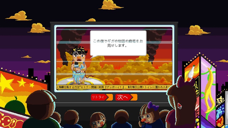 大怪獣を成長させ、街と住民を粉みじんにして悪の頂点に立つという設定とコンセプトは面白かったけど、結局、やっていたことはレーザーを撃ちまくるためにマウスをクリックしまくるだけだったような。ステージごとの個性付けも甘ければ、ボスも途中に挟まれる蛇足という言葉すら生ぬるいミニゲームの面白みのなさが突き抜けていて、クリアした時には達成感よりも徒労感が勝った。特にボス戦に関してはなんで素直に直接対決としなかったのか……。他の怪獣を成長させる2周目もあるとのことだけど、始めてみたら1周目と全くもって変わらなかったので、これにてお開き。
