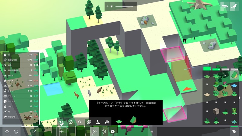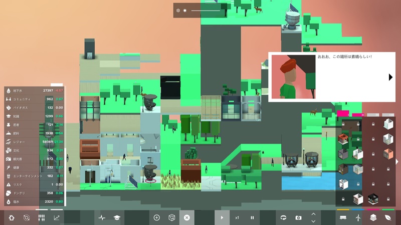 高低差のある箱庭空間内での街づくり自体は他の同テーマの作品にない新鮮味があり、物理法則を無視した組み方も許容されていたのが面白かった。各種施設や環境との相乗効果を考慮しつつ、最良の環境を考え出すパズル性と戦略性が融合したシステムも面白い。それだけに操作周りとインターフェース全般のわずらわしさが惜しかった。高いところに複数のパネルを重ね合わせて空間を作ろうとすると、狙いがズレてしまったり、意図しないところにパネルが出来上がってしまうなど、もう少しピンポイントを狙える機能があれば……。終盤の章だけプレイ時間がやたら長くなったのもそのせい。落ち着いた雰囲気やどこか微笑ましい世界観(とキャラクター)など、好印象に残った部分もそれなりにあっただけに勿体ない。