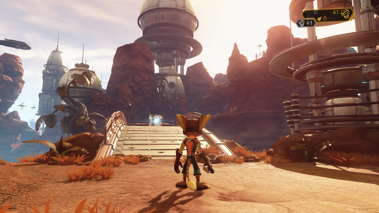 ◇武器ガラメカの特徴とシステムからは、戦闘イベント多めの印象を抱かせるが、ジャンプを駆使して足場を渡っていくアクションゲームらしい展開も豊富。場所によっては、ラチェットの持つオムレンチでボルトを動かし、次の場所へと渡れる足場を作り出したり、レールの上を高速で駆け抜けつつ、障害物を回避しながら進むというスピーディかつスリル溢れるアクションシーンもある。さらにミッションによってはラチェットではなく、宇宙船を操作して360度旋回可能な広大なフィールドを飛び回り、敵とのドッグファイトに挑むというバリバリのシューティングイベントまで用意されている。これ以外にも特殊装備による滑空アクションを駆使して探索するイベントもあったりと、とにかくプレイヤーを一瞬たりとも退屈させまいとする工夫が凝らされている。そこに前述した武器ガラメカを駆使した戦闘も挟まれるため、嫌でもその密度の濃さを思い知らされるはず。